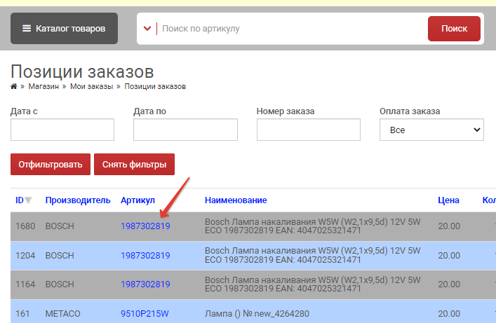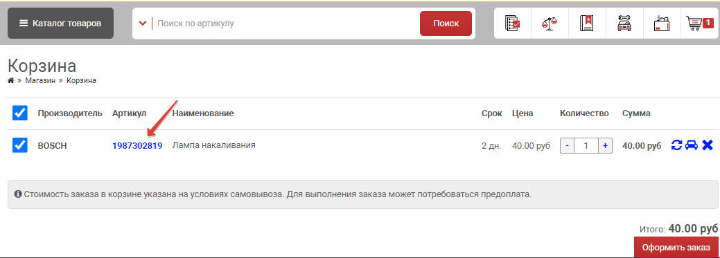В корзине, а так же в истории заказов(в позициях заказа) поле "артикул" сделали активной ссылкой. Т.е. при нажатии на нее клиент попадает сразу в выдачу с ценами, минуя все промежуточные этапы.