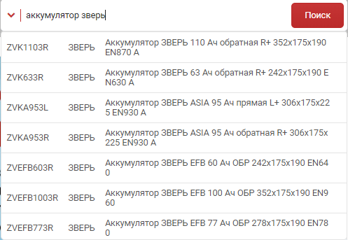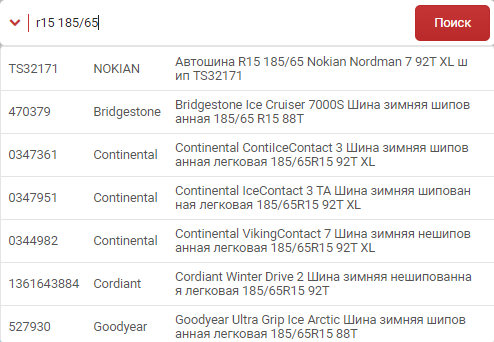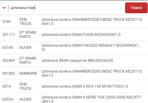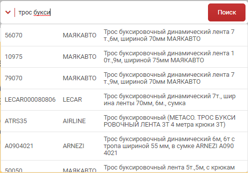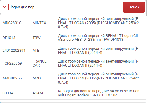 Ну и самая главная, на данный момент, функция - поиск по наименованию в строке поиска по артикулу. При вводе от 3х символов в строке поиска по артикулу появляется выпадающий список с деталями по точному совпадению. Причиной внедрения стали трудности при поиске всевозможных акссесуаров, жидкостей, инструмента и других деталей явно не представленных ни в одном каталоге на рынке. С помощью такого поиска вы сможете легко найти такие детали как: изолента, краска, хомут, держатель для телефона, диск отрезной, трос бусировочный, тонировка и даже велосипед и так далее... Так как поиск работает от 3-х символов, то по запросу "фил воз ren" результат будет "фильтр воздушный renault", притом порядок написания не имеет значения. На данный момент в базу поиска внесены 250000 товаров с описанием. Очень много внесли товаров для грузовиков(рессоры, шпильки, колодки и тд.)