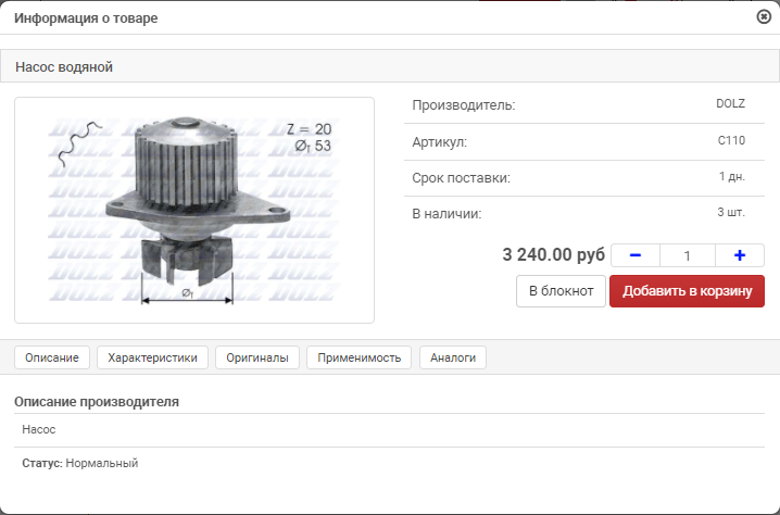 Внедрен модуль показа характеристик детали. В случае если деталь есть в базе на странице проценки появляется блок с фото, при раскрытии которого вы увидите такую информацию как: фотография запчасти; описание, свойства; оригинальные номера, соответствующие данному товару; применимость к автомобилям; неоригинальные номера (аналоги), соответствующие данному товару.