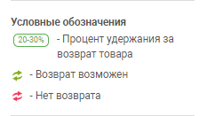 Не весь товар не возможно вернуть поставщику обратно по многим причинам. В некоторых случаях поставщик может назнчить процент удержания от стоимости товара за возврат. Специально для этого cделана доработка позволяющая определить клиенту можно ли вернуть товар или нет. У каждой позиции в процеке теперь есть специальный символ, дающий понимание о возврате.